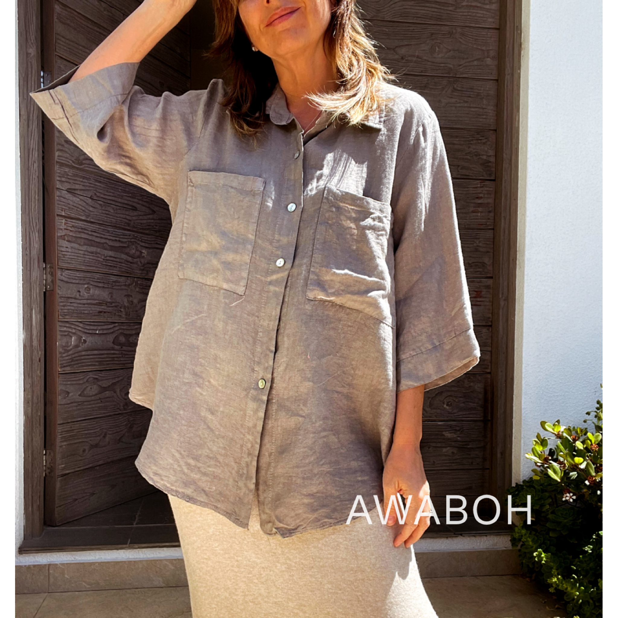 Blusa con bolsillos en pecho, manga 3/4, cuello camisero.