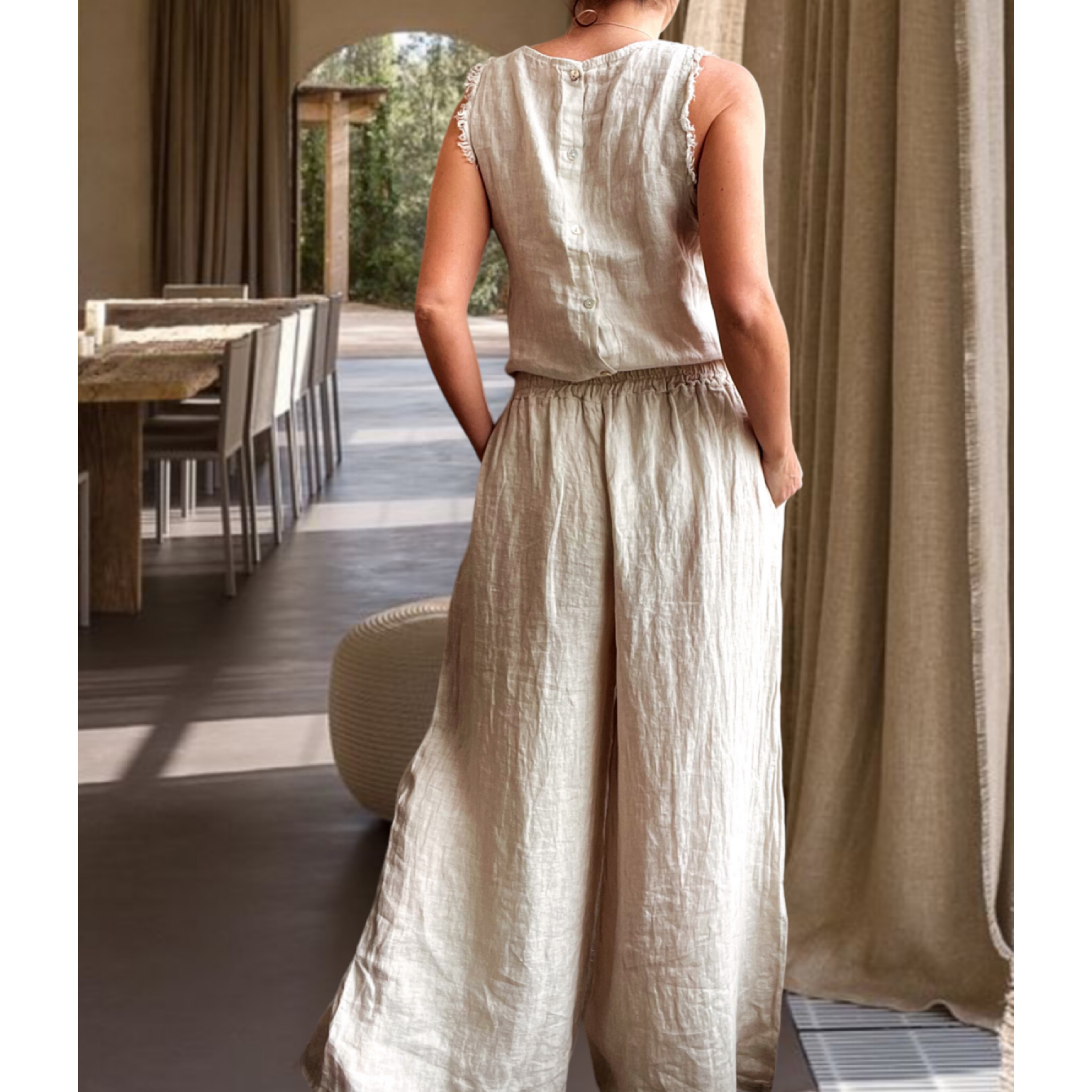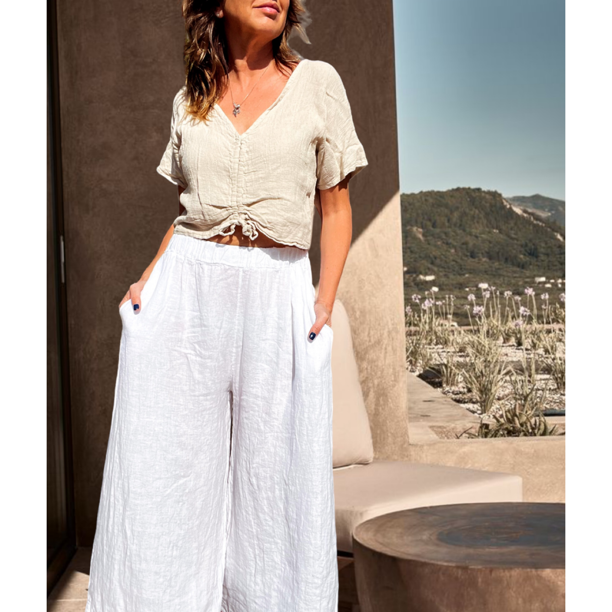 Pantalón con elástico en cintura, bolsillo estilo palazzo.