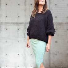 Falda elasticada en la cintura, recta, abierta en un costado.